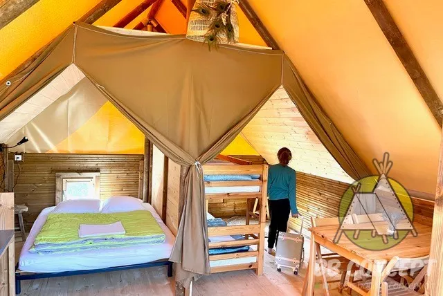 Nos tentes sont parfaitement intégrées dans un cadre naturel, offrant une ambiance chaleureuse et conviviale. Que vous soyez en famille, en couple ou entre amis, cette option vous permet de profiter du camping en toute simplicité et sans tracas. Venez vivre un séjour au grand air, alliant nature, confort et originalité !